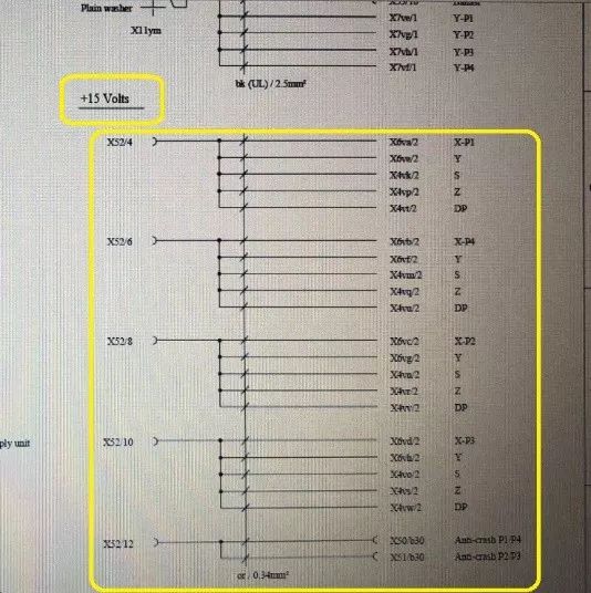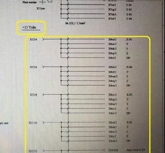 根據電路圖分析,各軸控卡和碰撞卡的X52/4,X52/6,X52/8,X52/10,X52/12端子均由15V電源卡供電,如下圖所示:
