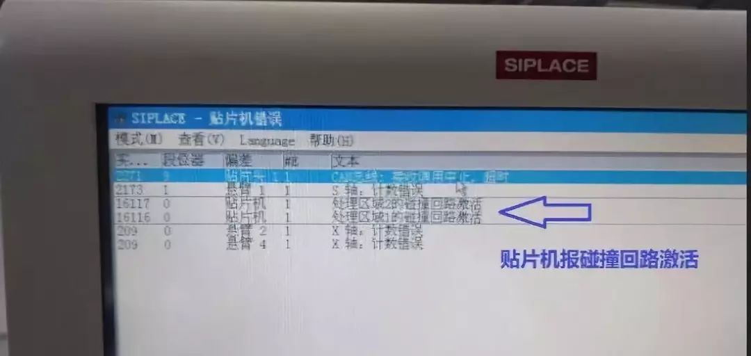 (2)、貼片機碰撞回路被激活以及4個區多個軸報錯,屏幕顯示報錯信息如下: